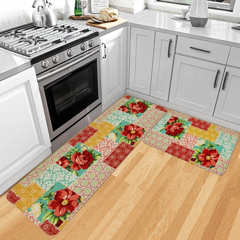 Safarsa Kitchen Mats for Floor Set of 2 Pieces Kitchen Rugs and Mats Non Skid Washable Kitchen Floor Mat(17" Wx30 L+17" Wx 47" L Boho Flowers)