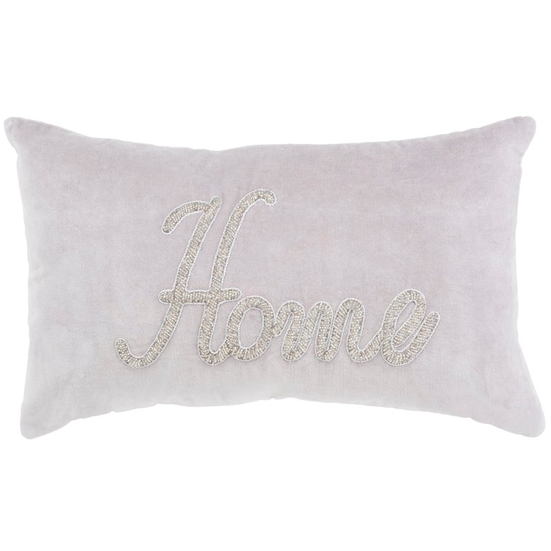 - Plush grey cotton velvet fabric has embroidered beads that spell out 'Home'