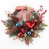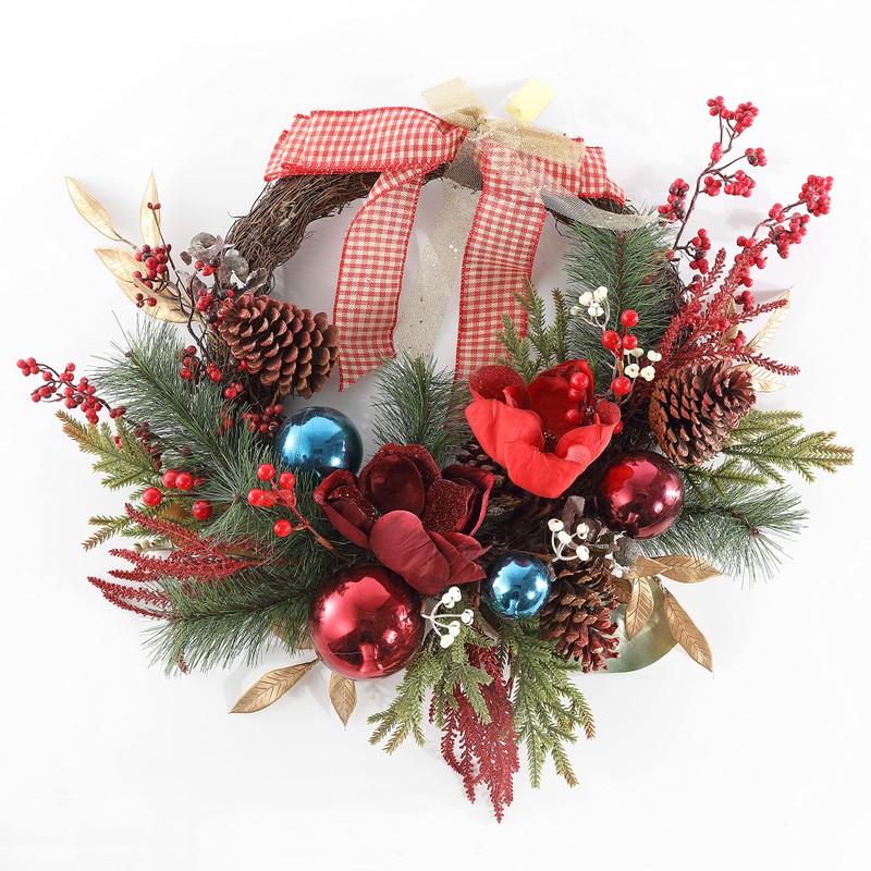 - [DECORATIVE ARTIFICIAL WREATH]: This wintry wreath features artificial magnolia, pine cones, red and blue ornaments and a bow to make for an enchanting winter home décor accent