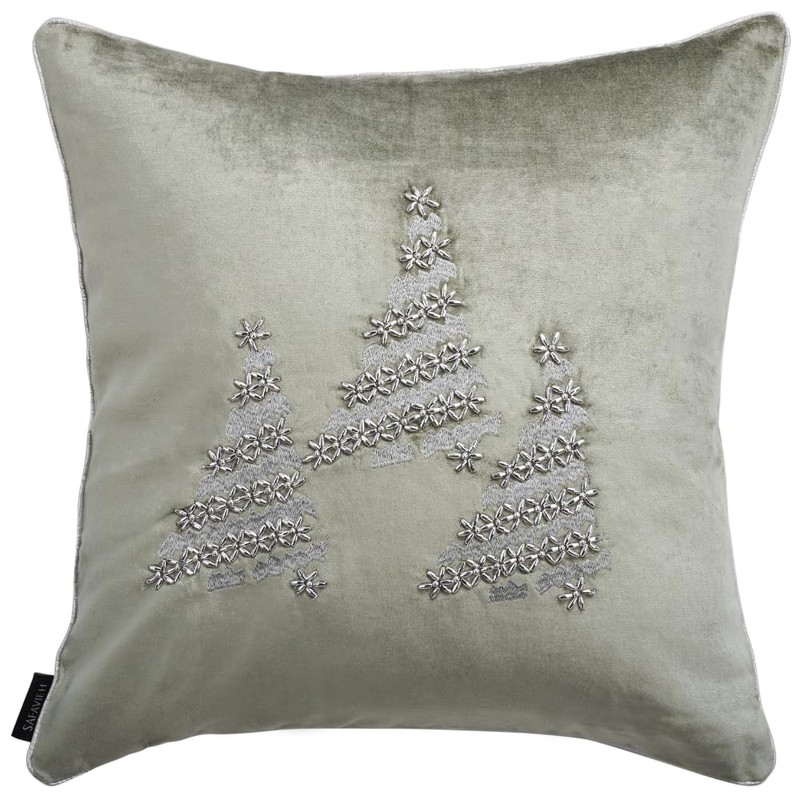 - [CHIC DESIGNER DETAILS]: Features intricately stitched and beaded shimmering Christmas trees over a silver cotton viscose blend cover
