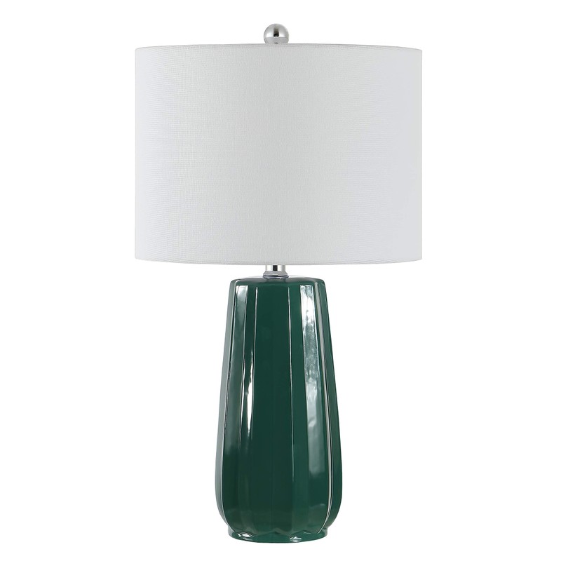 - [Stylish Design]: Features glossy dark green ceramic and a classic white drum shade; On/Off rotary switch