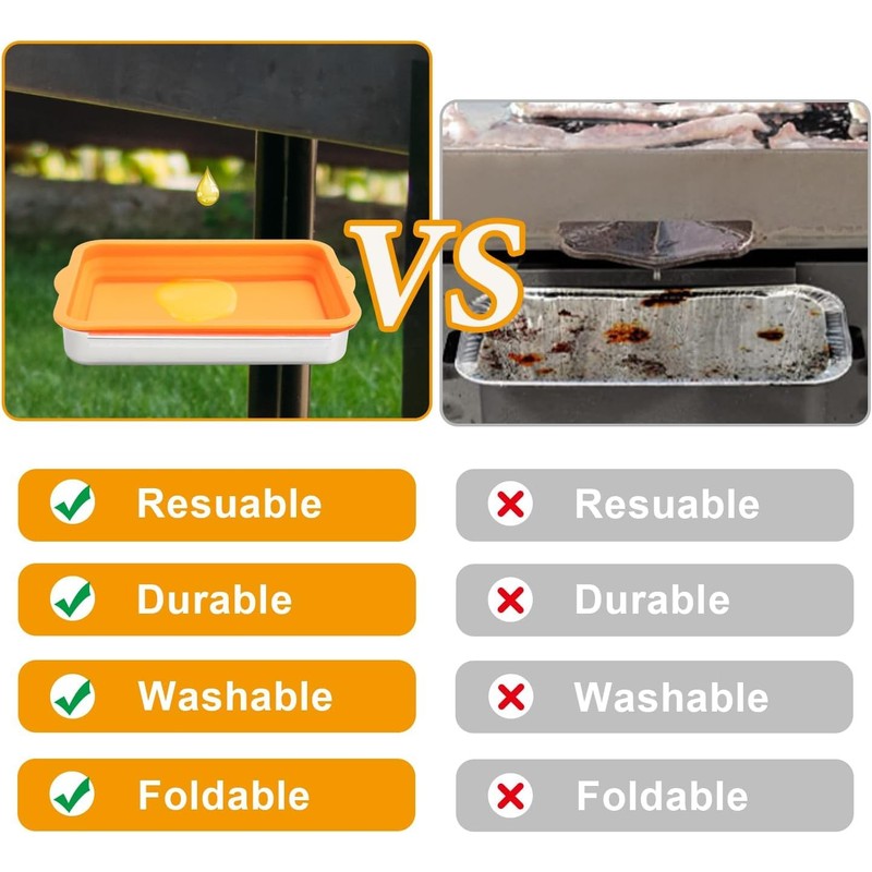 Silicone Drip Liners Included: The package includes 1 Grease Drip Pan and 2 Silicone Drip Pan Liners. These reusable silicone liners are eco-friendly, durable, and easy to clean. They save you money compared to disposable aluminum foil pans.
