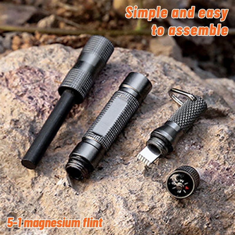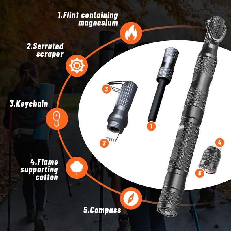 - 【Multi functional integrated design】 integrating keychain, serrated scraper, magnesium rod, combustion cotton, and compass to meet various outdoor and emergency needs.