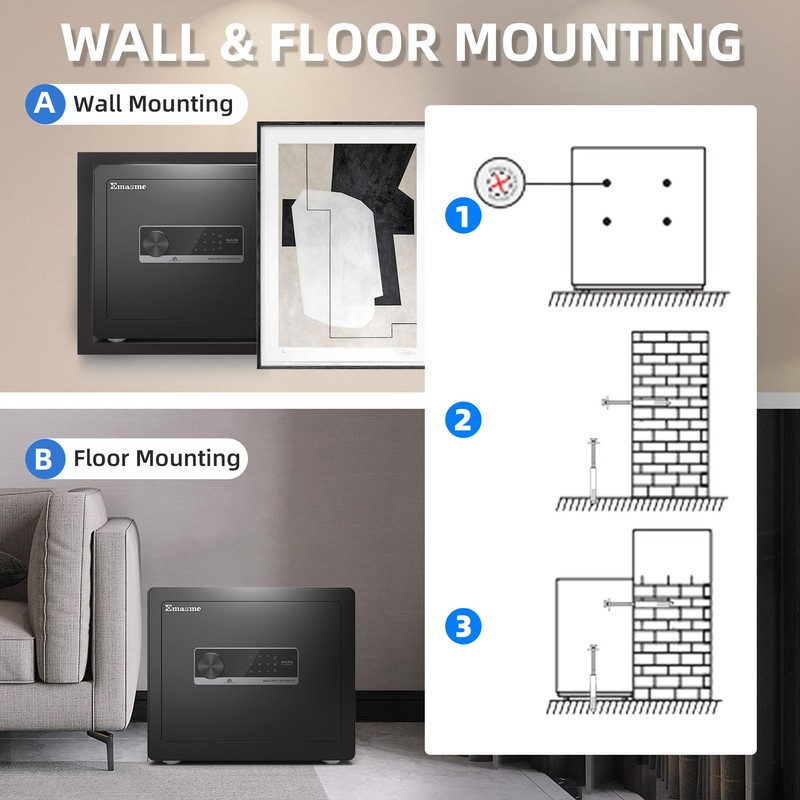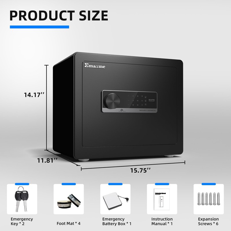- THREE UNLOCKING WAYS : When you choose the EMASME safes for home, you receive more than just a product. The comprehensive package includes the safe box itself, two keys, six expansion screws for rock-solid installation, an emergency battery box, four non-slip foot mats for stability, and a user manual to guide you through the setup process. We stand behind our product with round-the-clock customer service and a 90-day unconditional return policy, ensuring your satisfaction and peace of mind.