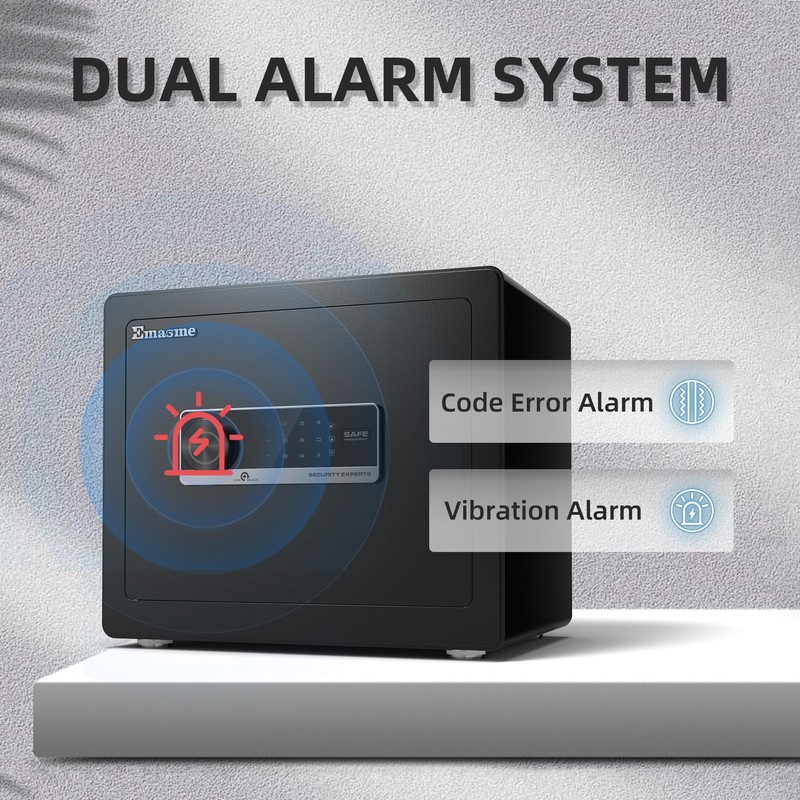 - DUAL ALARM MASTERY: With our EMASME Home Safe. Crafted with cutting-edge one-piece bending ,equipped with a dual alarm system, Three-incorrect entries or shake the cabinet body after press 9 number can activate the alarm system, the safe immediately triggers a loud 70-decibel alarm, deterring intruders,effectively keep your secret away from anybody