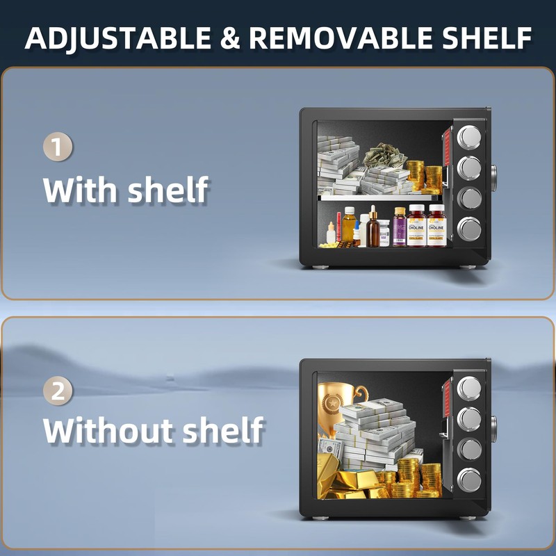 - REMOVABLE AND ADJUSTABLE SHELF: This safe box is not just about security; it also provides ample space and offer you numbers DIY organization options. use removable and adjustable shelf, you can customize the interior layout according to your needs.