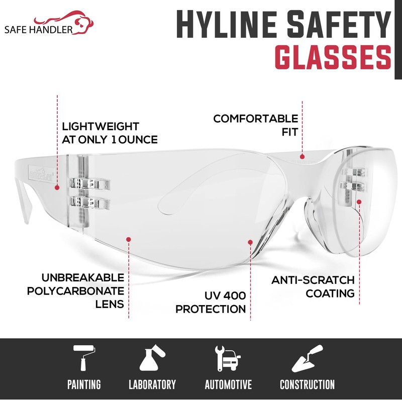 - SAFE HANDLER by Bison Life - Hyline Safety Glasses, 12 pairs of clear safety glasses (1 box)