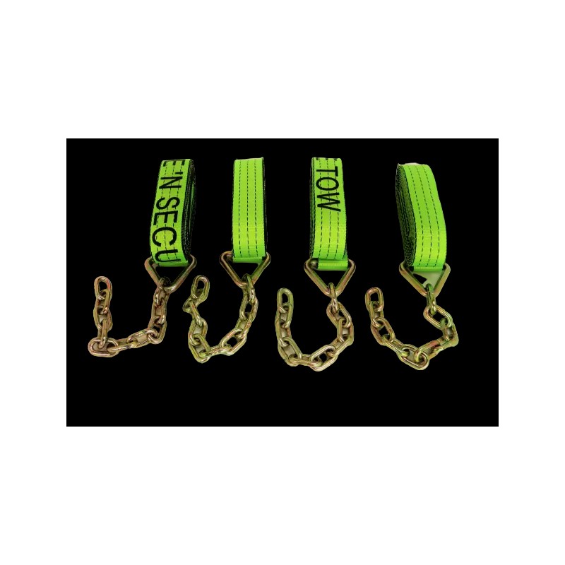 8 Point Kit of 14' Hi-VIZ Green TECNIC Webbing Rollback / Flatbed Car Tie-Downs with Chain Tails and USPS Priority Shipping Included!