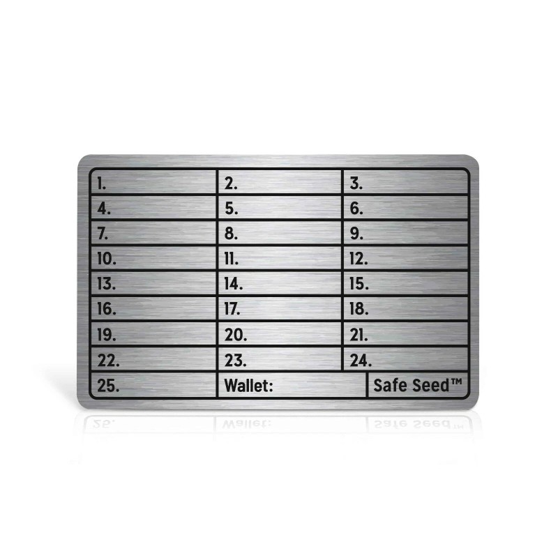 Safe Seed Metal Wallet Titanium Edition 12-25 Word Crypto Recovery Passphrase Stamp Plate · STRONG TITANIUM PLATE TO SECURE YOUR CRYPTO RECOVERY PASSPHRASE · COMPATIBLE WITH ALL HARDWARE WALLETS (LEDGER, TREZOR, KEEPKEY) AND ALL SOFTWARE WALLETS · OPTIONAL 25TH WORD STAMP SECTION ON THIS PLATE · MELTING POINT ~3000°F YOU CAN BE SURE YOUR SEED IS SAFE · SECURE YOUR CRYPTO WITH SAFE SEED TODAY! · Safe Seed Titanium Edition seed phrase cold storage. Safe Seed is a simple and straightforward way to secure your BIP39 crypto assets. Precision laser engraved heavy duty Titanium plates will withstand just about anything along with a melting point of 3000°F (Almost triple the average house fire) you can be sure your seed phrase is safe. Just stamp it out with your 12-25 word recovery phrase and secure it in a safe place. For added security you can stamp half of your phrase on one plate, half on another plate and keep them in separate locations. A bench block is recommended for the Titanium plate, it makes it much easier to stamp and get a deeper impression. Recommended stamp kit sizes are · Check out our other listings for additional metal options (Molybdenum, Copper, Silver, Steel plates, 5oz Silver Bars), the complete stamp kit, and other accessories. Included: 1 Titanium Metal Plate and Instructions. Compatible with all hardware wallets like Trezor, Ledger, Cool Wallet, Coldcard, BitBox, Keepkey, Cobo Vault, Ellipal and software wallets such as Coinomi, Blockchain,Enjin, Atomic, Wasabi, Phoenix, Ownbit, BRD, Exodus, Mycelium, Samourai, Copay, Jaxx, Coin, BlueWallet. GET YOURS TODAY AND SECURE YOUR CRYPTO FOR THE FUTURE! |
