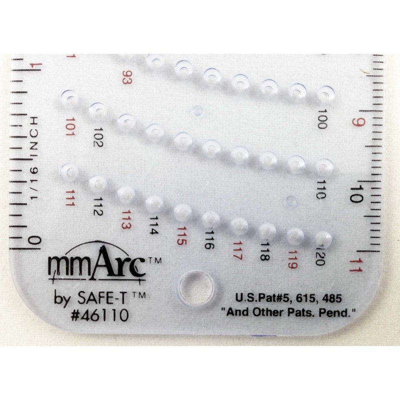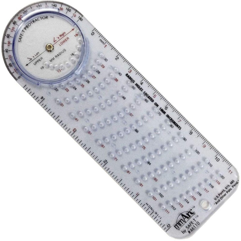 - Safe-T 46110 mmArc Protractor Compass Plus, 15.8 cm long, Made of Clear Plastic with Bluish Hue, Semicircular side with rotating disc inset on one edge, Spinning and Accurate Protractor revolves easily within a groove, Creates Circles from 10mm radius to 120mm radius on 1mm radius increments, Allows direct view of vertex points