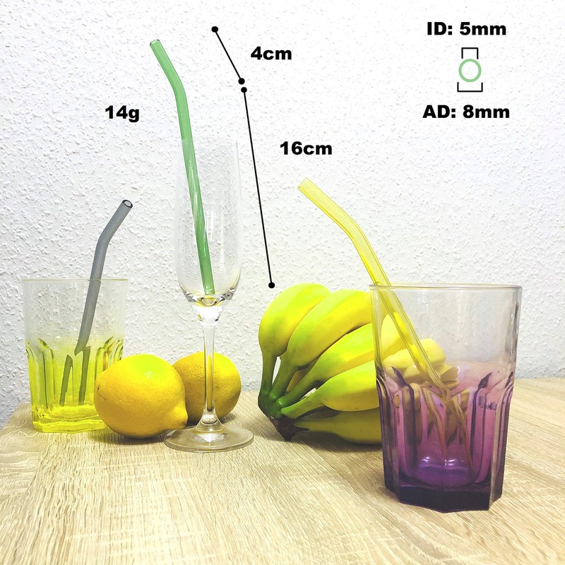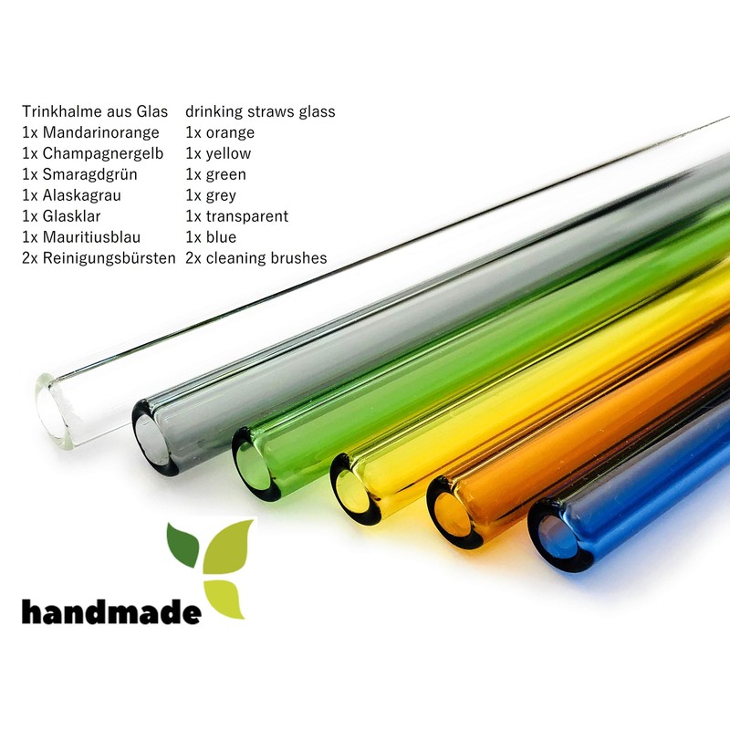 - Shatterproof, almost unbreakable, these are made of borosilicate handmade straws and impress with their very long durability. Dimensions: The set includes 6 straws in beautiful colours mandarin orange, Mauritius blue, Alaska grey, emerald green, champagne yellow and crystal clear with a length of 20 cm + 2 cleaning brushes in the length of 17 cm. The straw has an inner diameter of 5 mm, the outer diameter is 8 mm