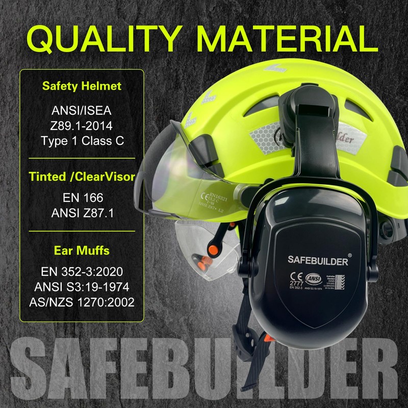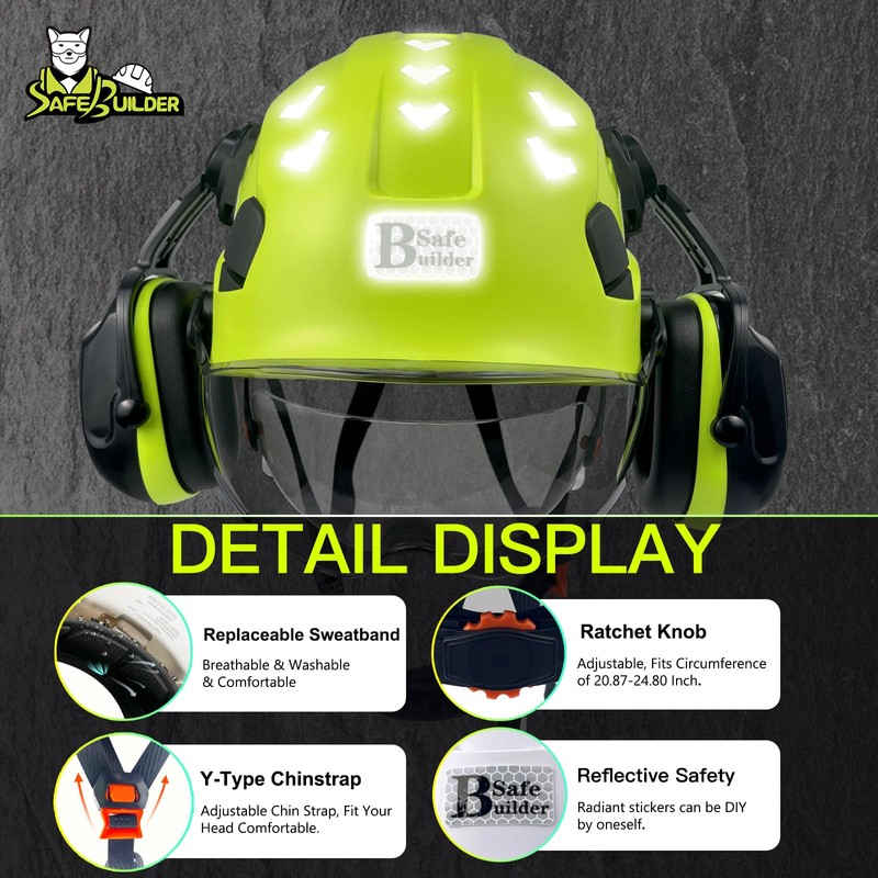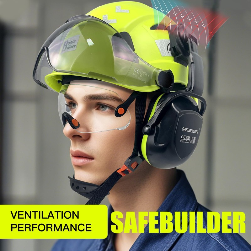 SAFEBUILDER Safety Hard Hats with Visor Hearing Protection 4 in 1 Safety Helmet Lightweight Adjustable Breathable 6-Point Suspension Head Protection ANSI Z89.1 Approved (Green+CSV+B&G 07 Ear Muffs)
