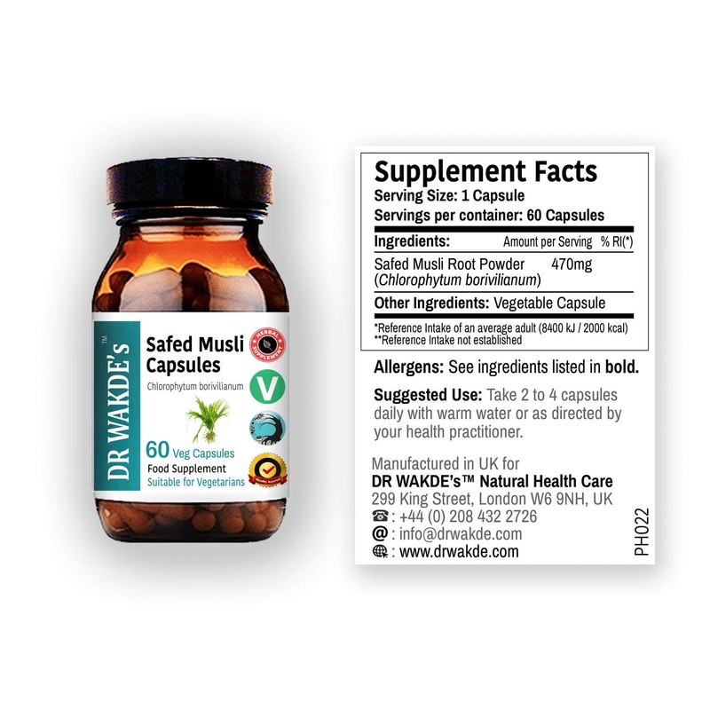 - DR WAKDE’S SAFED MUSLI: A Herbal Supplement used traditionally in Ayurveda to support a natural and balanced healthy lifestyle. Contain Safed Musli root in a capsule