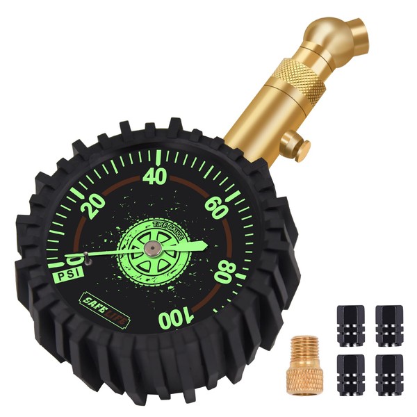 • Large 2.5'' Glow Dial -analog tire pressure gauge features easy-to-read 0-100 PSI scale that glows in the dark, providing super accurate readings anywhere. Includes a 360-degree swivel ball brass tire chuck w/ 4.5mm extended tip,easily access to the tire valve from any angle and get a great seal with no air leakage.