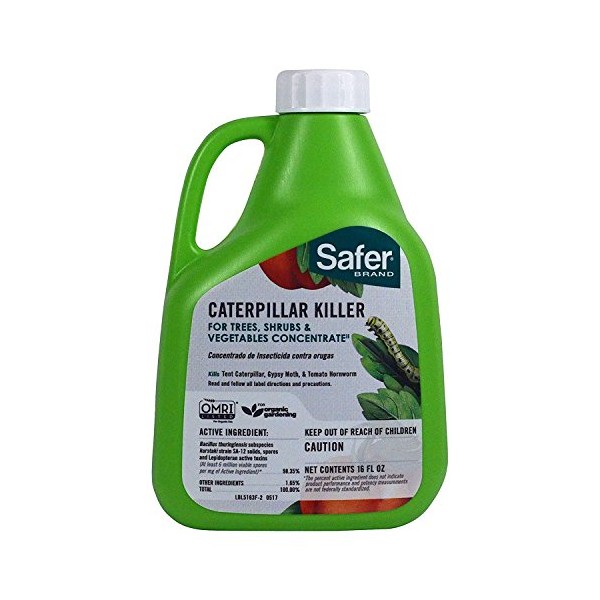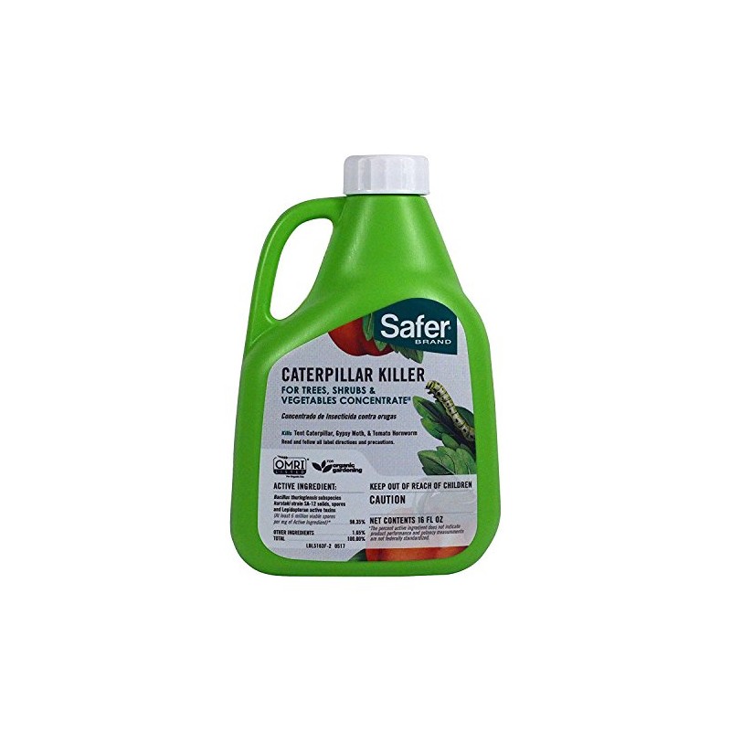 Safer Brand 16 oz. Caterpillar Killer II Concentrate kills worms and caterpillar stage insects but has no effect on birds, earthworms, or beneficial insects when used as directed. The caterpillars and worms that are damaging your plants will stop feeding immediately after ingesting the bacterium, which is known scientifically as Bacillus Thuringiensis var. Kurstaki (B.t. for short).Use in late afternoon or on cloudy days since the BT breaks down in sunlight. Controls tent caterpillars, gypsy moths, cabbage loopers, tomato horn worms and more. Safer Brand Caterpillar Killer is OMRI Listed and can be used up until the day of harvest.