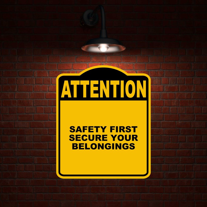 SAFETY FIRST SECURE YOUR BELONGINGS Attention Yellow Black Aluminum Composite Sign 8.5 x 10 inches