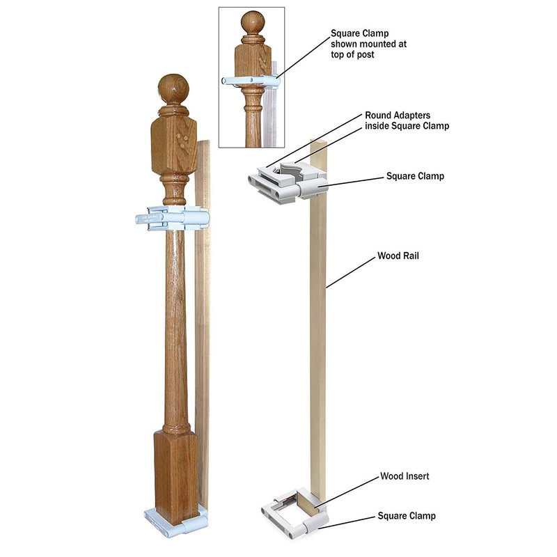 - WHAT IS INCLUDED? - The Kit Includes 1- 36" Wood Strip, 2 Square Clams, 2 Wood Inserts For Clamps, 1 Set Round Adapters, 4 Bolts, 1 Set Of Interlocking Shims, 2 Finish Washers, 2 - 1 1/2" Screws, 2 - 1 3/4" Screws And Instructions. The Screws Listed Are For Attaching The Wood Rail To The Clamps. No Screws Go Into Your Post!