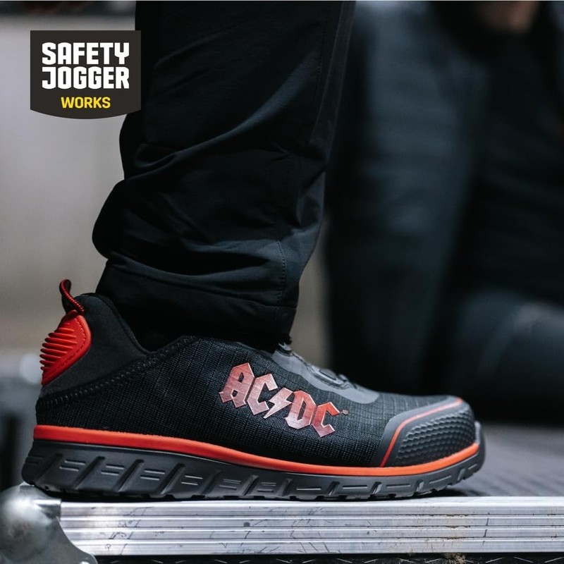 SAFETY JOGGER Safety Shoes with Carbon Toe Cap - Ligero - Lightweight, Comfortable S1P Work Shoes for Men and Women, Non-Slip Trainers with Screw Closure, Metal-Free, Black with Red Ac Dc Logo, 47 UK