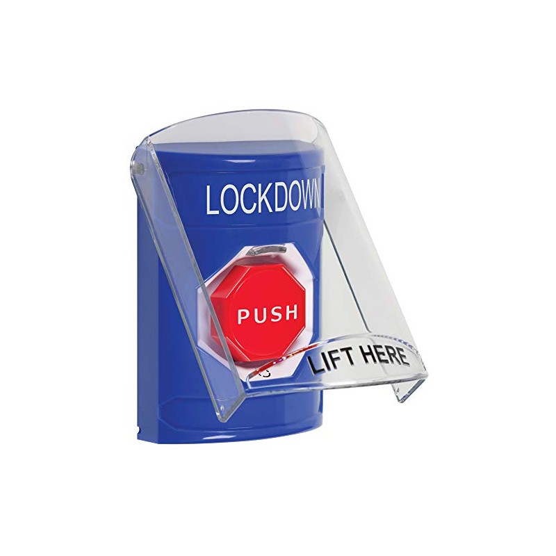 Safety Technology International, Inc. SS2429LD-EN Stopper® Station Push Button with Stopper® Station Shield, Turn-to-Reset, Blue, Lockdown Label