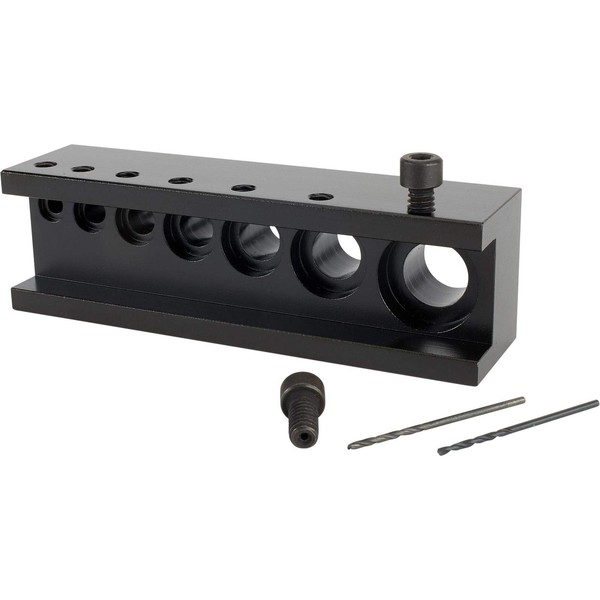 - Includes two case hardened threaded bushings and two 1/16" cobalt steel high speed bits