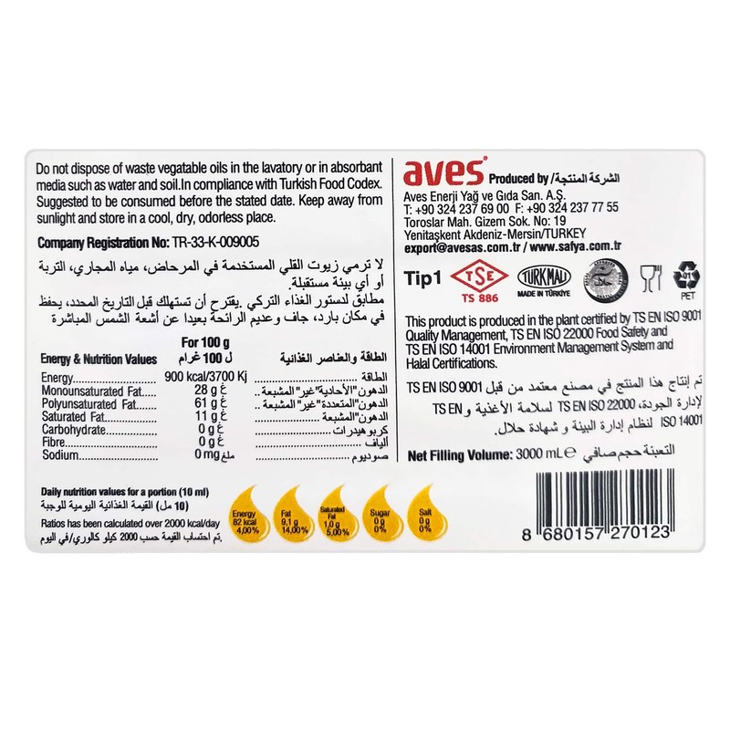 Safya sunflower oil is produced in fully integrated vegetable oil factory, which boosts the largest crushing capacity of Turkey, owned by Aves Oil. Right from the field up until the table, whole production process is automated with cutting edge hygiene standards. Owing to its quality and unique bottle design, Safya sunflower oil penetrated the market with extraordinary success.