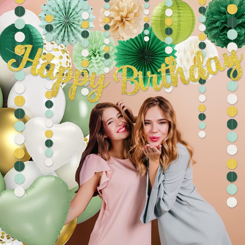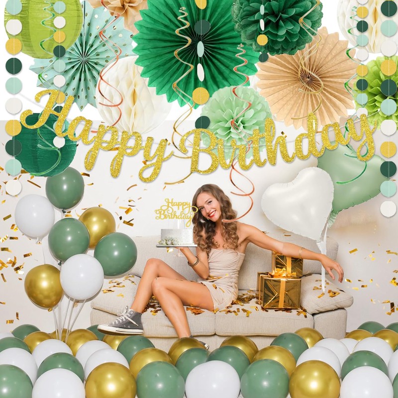 - Easy to Assemble: The paper fan and paper lanterns are easy assemble, the birthday banners can be diy, the circle dots paper banner has been assembled but tissue paper pompoms take more time to put together, please diy with the instructions. Green and champagne gold balloon set is matched with a balloon chain, which can make a balloon arch, string the balloons together and hang them on the door, wall, fence