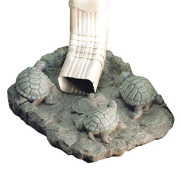 - EYE-CATCHING DESIGN: Three charming turtles are climbing over rocks in this decorative splash block. This delightful downspout extension adds charisma to your garden and curb appeal to the lawn while also serving a functional purpose.