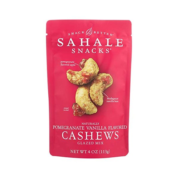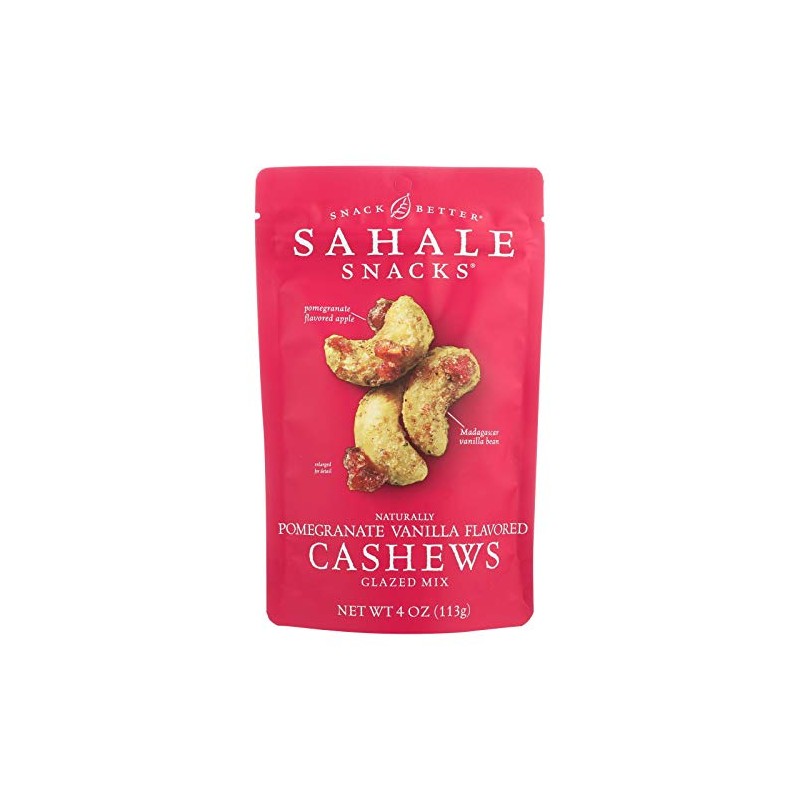 Sahale snacks naturally pomegranate vanilla flavored cashews glazed mix started with finding a rich fragrant madagascar vanilla. We grind the whole bean creating a creamy vanilla flavor and then pair it with tart pomegranate flavored apples and whole dry roasted cashews. It’s sweet tart crunchy and so worth the hunt. Every bite should be an experience: the cherished recollection of a childhood dessert or the exotic flavor of a far-flung place. So buckle up and dig in. See nutrition fact panel for allergens. Includes one 4 oz. Bag of sahale snacks naturally pomegranate vanilla flavored cashews glazed mix.country of origin : united statesis gluten free : yesis gmo free : yesis kosher : yessize : 4 ozpack of : 6selling unit : caseingredients : cashews;dried apples;unsulfured apples;sugar. Natural pomegranate flavor;citric acid;fruit and vegetable juice [for color];organic cane sugar;organic tapioca syrup;brown sugar;natural vanilla extract;sea salt;dried pomegranate;pomegranate juice concentrate;dried orange peel;pure ground vanilla beanskeywords : fiber;free;gluten;nut;protein;snack