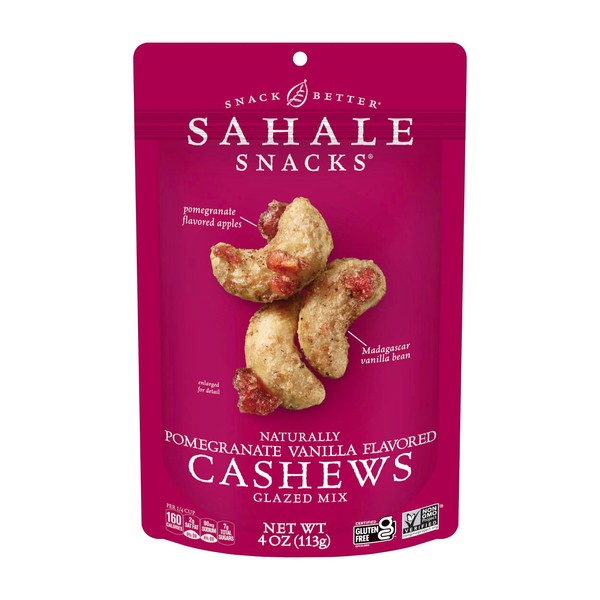 - Contains 6- 4 Ounce Resealable Pouches of Sahale Snacks Pomegranate Vanilla Flavored Cashews Glazed Mix