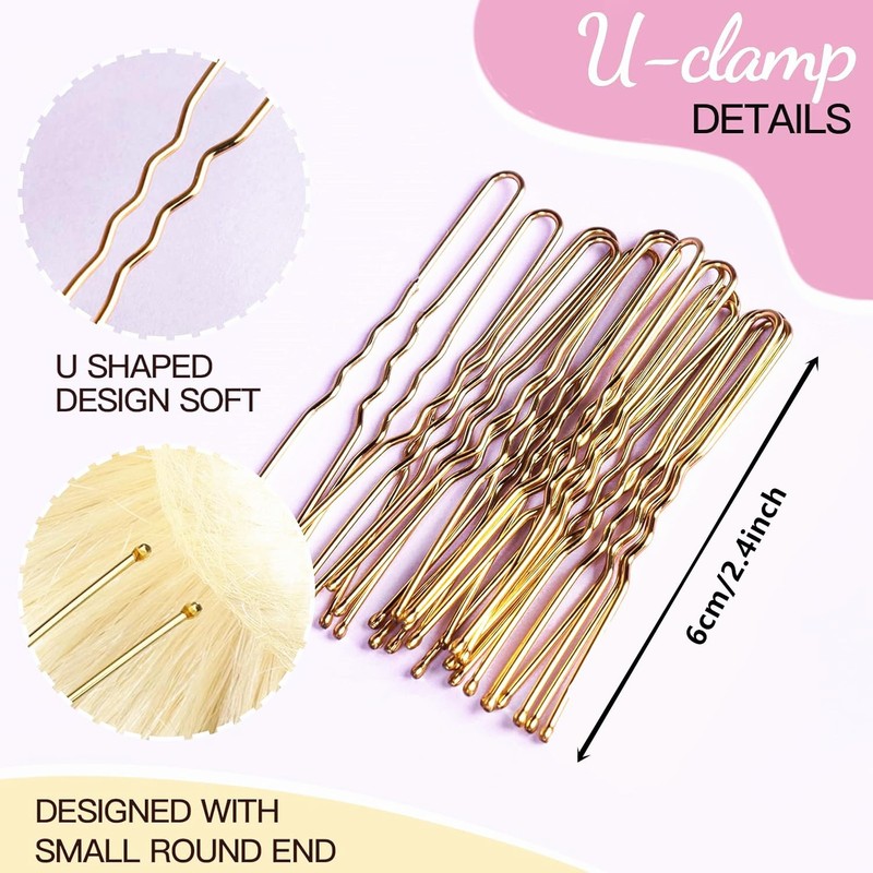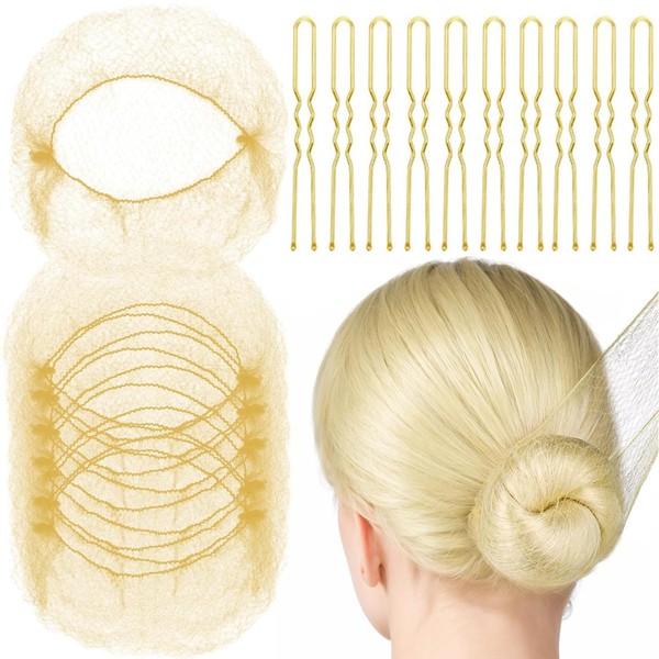 SAHENITEANA Kit de Red de Pelo Invisible y Horquillas en Forma de U,50 Piezas de 50cm Malla Invisible con Borde Elástico,10 Piezas Horquillas en Forma de U Posicionamiento para Mujeres pelo Moño(Dorado)