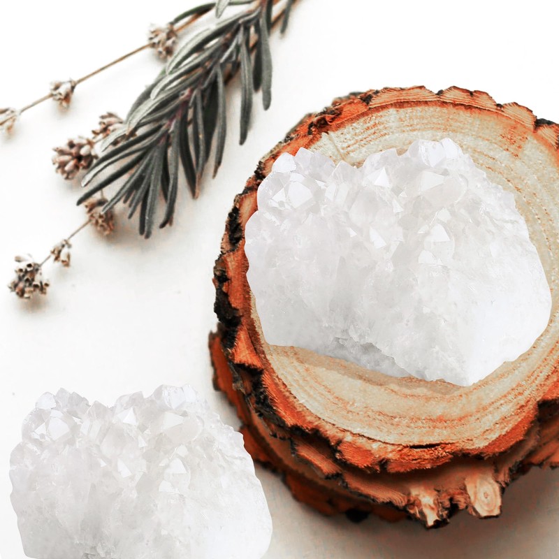 - Rock crystal druse: clear quart can protect against negative energy, stimulate brighter feelings, promote spiritual growth and connect with all chakras.