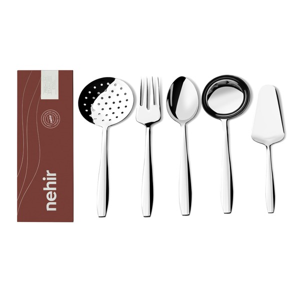 Sahra Sade 5-Piece Stainless Steel 18/0 Cr-Ni (Rust-Proof) Service Set - Dishwasher Safe - 10 Year Guarantee Against Rust - Monoblock Technology - Includes Ladle, Skimmer, Serving Spoon