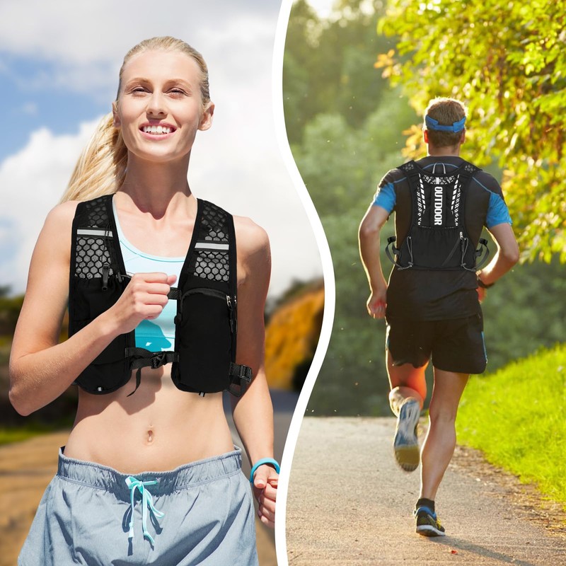 If you're into trail running or high-intensity outdoor activities, this lightweight, adjustable running vest is your perfect companion. With adjustable shoulder and chest straps, it fits various body types, ensuring no bouncing while you run, offering a stable experience. The unique back design promotes airflow to keep your back cool and dry, and the soft mesh on the straps enhances breathability, making it super comfortable. Made from waterproof nylon fabric, it keeps your gear safe and dry, even on rainy days. The main pocket has a 5L capacity and features an internal compartment to help organize your items. There’s also a zippered pocket on the left chest and an elastic pocket on the right side, perfect for a 500ml water bladder. Additionally, the shoulder straps have a whistle for added safety during outdoor activities. For increased visibility and night-time safety, the running hydration vest backpack features reflective strips, making you more noticeable in low-light conditions. Whether it’s trail running, marathons, climbing, or just hiking, this backpack delivers both comfort and functionality. It’s the perfect gift for any outdoor enthusiast, too!