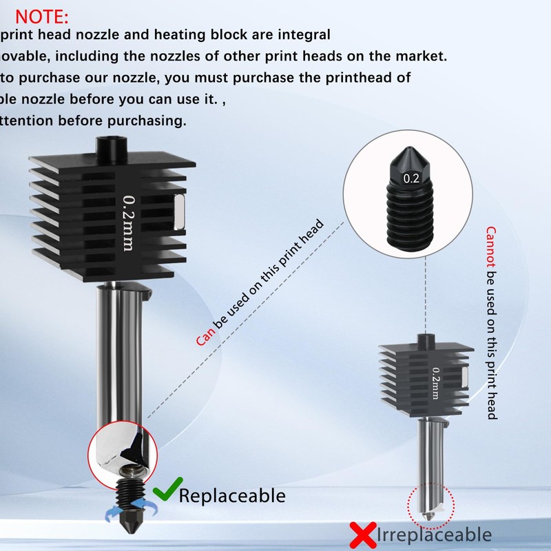 - Multiple sizes of nozzles available: Come with 1PC 0.2mm,1PC 0.4mm, 1 PC 0.6mm nozzle and 1PC 0.8mm, different nozzle sizes, with different printing speeds, compared to 0.2mm 0.4mm nozzles, printing with 0.6mm and 0.8mm nozzles can achieve faster printing speed