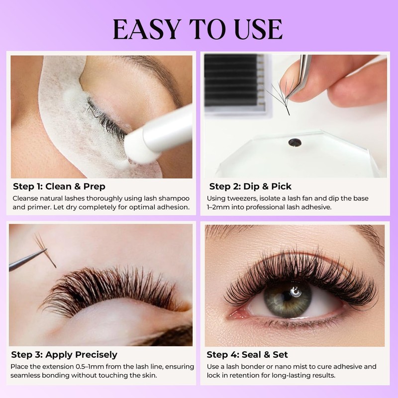 With a deep black color and uniform fiber alignment, these lashes make it easier for lash artists to build full, balanced volume sets with precision. They support various styling techniques, from soft natural volume to bold, dramatic effects-suiting the needs of every lash client.