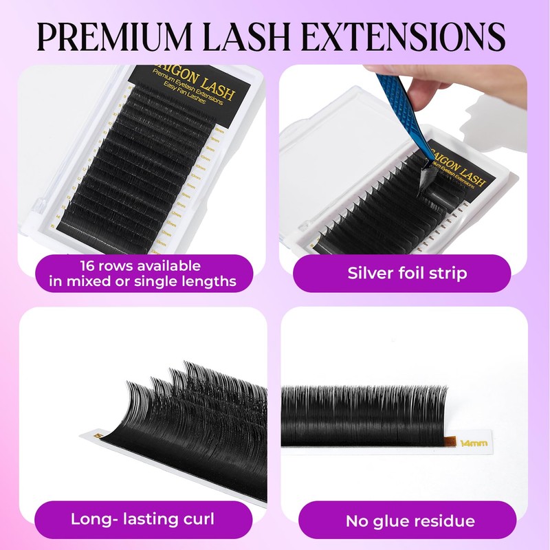SAIGON LASH Easy Fan Eyelash Extensions, Volume Lash Tray for Lash Techs, C/CC/D Curl, 0.03/0.05/0.07mm Thickness, 8-15mm Mixed Lengths, 16 Rows, Soft PBT Material, Black (D-0.05)