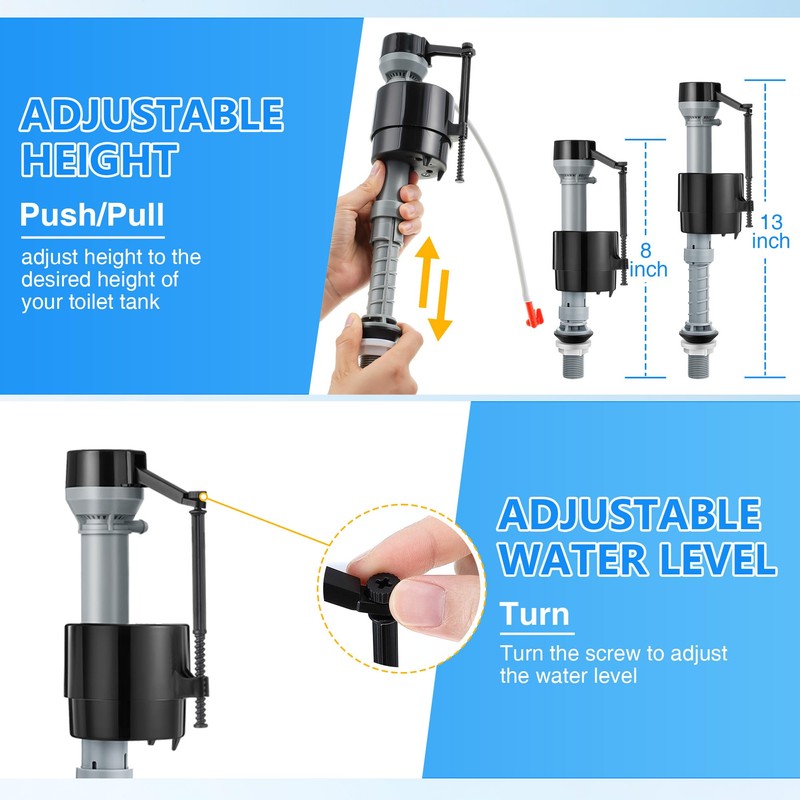 - [High Efficiency and Low Flow] Optimize your toilet's performance with precision water level control using our fine water level adjustment screw. This high efficiency toilet valve replacement kit addresses slow filling, noisy, and running toilets effortlessly. Its adjustable height adapts from 8 to 13 inches, ensuring a perfect fit for your toilet tank's unique needs while ensuring rapid and quiet tank filling