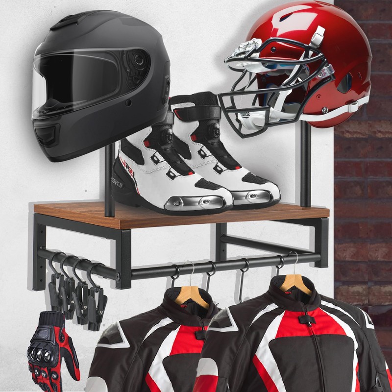 - 【Powerful storage】The top can hold 2 helmets, motorcycle helmets or football helmets, etc.The boards can store motorcycle shoes or photo frames and trophies.In addition, there are 3 rods on the stand for hanging items.Multiple motorcycle clothes and pants can be hung on the front bar.Both sides of the bar with 4 clips to organize gloves, keys, IDs.