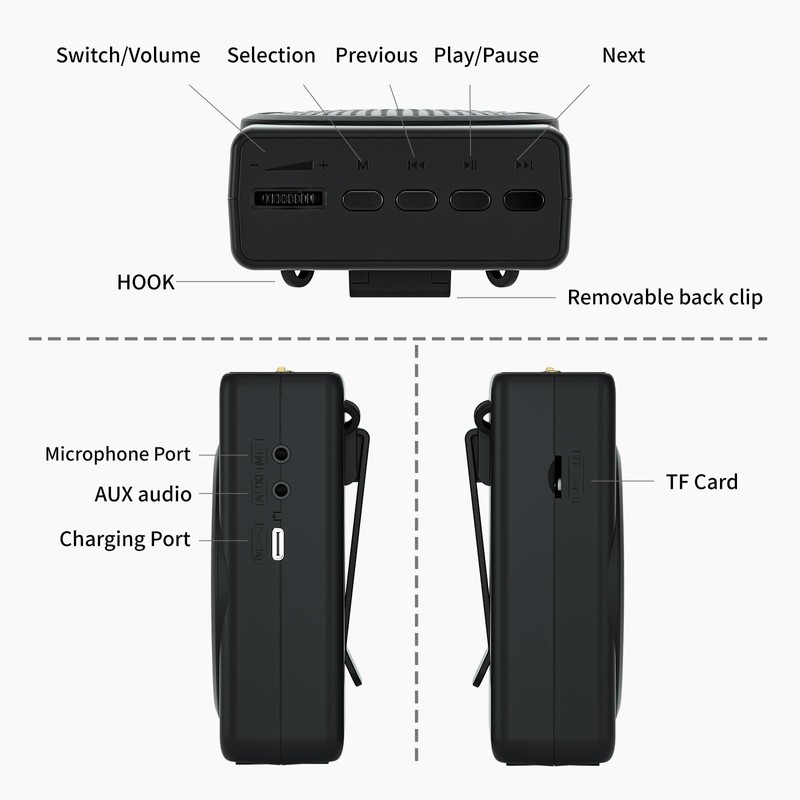 • (features) voice amplifier can be used with the help of a belt hanging around the neck or tied around the waist, support for TF card playback , repeat playback of a single song, loop playback of all the music and switching songs