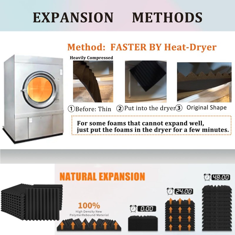 - Easy Installation & Versatile Use -Lightweight and easy to install on any wall surface with 3M Double Sided Foam Tape (not included -Additional purchase). Our Noise Dampening Panels are non-adhesive,Double tape/ or glue must be purchased separately. Please note: Products are packaged in a compressed state. After unpacking the product, just put it into the dryer for new minutes.