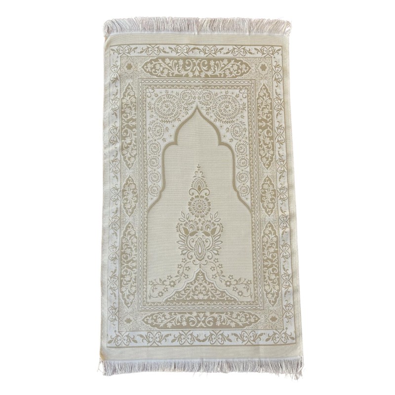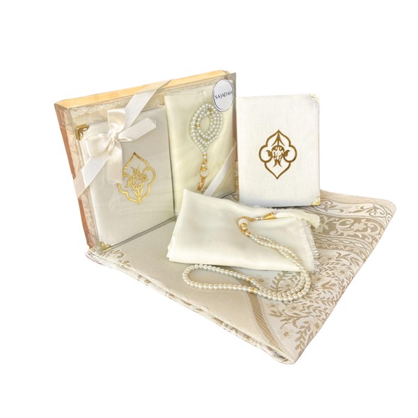 SAJADAH Muslim Prayer Rug Set - 4 in One Islamic Gifts: Prayer Mat, Beads, Hijab, Surahs Book, Hajj Umrah & Ramadan Gifts for Muslim, Islam Eid (Cream)