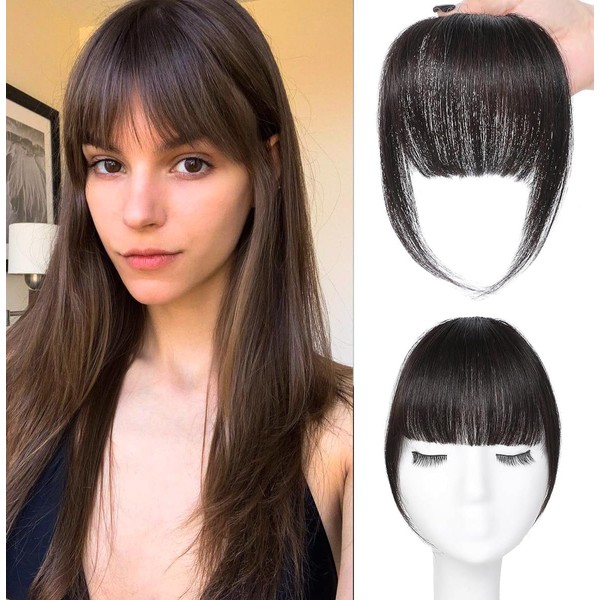 SAKALAKA Clip in Bangs Real Human Hair Wispy Bangs Clip in Hair Extensions, Brown Black Air Bangs Fringe with Temples Hairpieces for Women Curved Fake Bangs for Daily Wear (Brown Black, Air Bangs)
