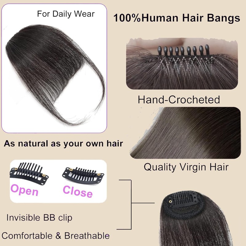 - Real Human Hair Bangs: High-quality human hair clip on bangs, shiny, soft and smooth as your own hair. Creating the most lustrous and realistic natural effects. It can be curled, straightened or dyed into other colors and styles as you like. The hair bang may be messy after a long time shipping, Please wash it with water and blow dry it, then make it anyway you want.
