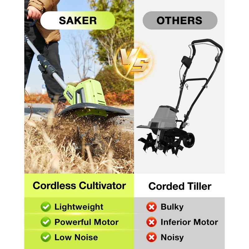 Saker 22V Cordless Electric Garden Tiller Cultivator, Lightweight Rototiller ...