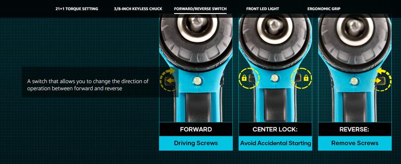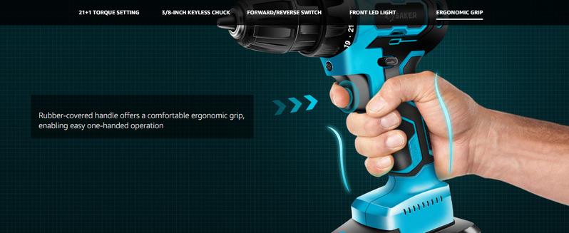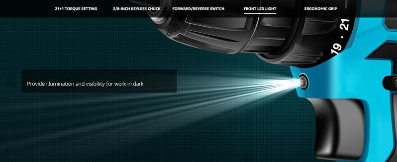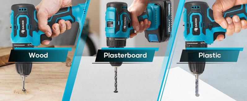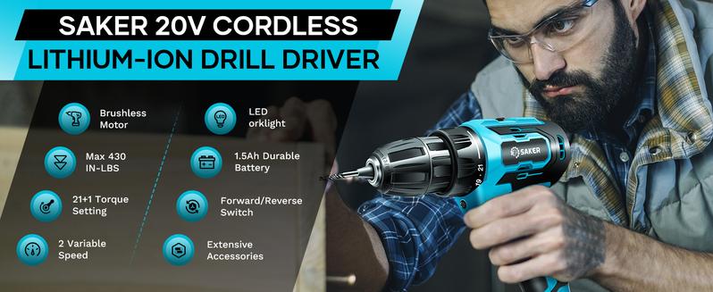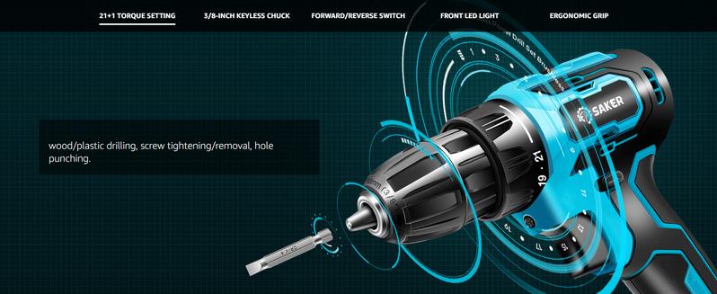 【21+1 TORQUE SETTING & FORWARD/REVERSE SWITCH】The Saker power rig has a maximum torque of 430 in-lbs. With 21+1 torque Settings and forward/reverse switches, this cordless drill offers a variety of functions, including wood and plastic drilling (not suitable for masonry and concrete), screw tightening, hole punching and screw removal.