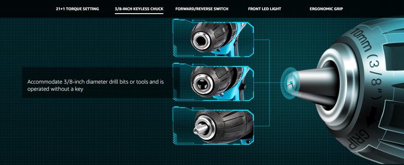 【ADJUSTABLE SPEED & 3/8-INCH KEYLESS CHUCK】The Saker drill has a powerful brushless motor that provides superior driving force. 2 adjustable speed Settings (0-600 & 0-1,800 RPM) make it easy to choose the speed for various tasks. Equipped with a 3/8-inch keyless metal chuck, our power drill RIGS ensure easy bit change while providing versatility.