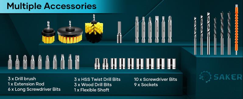 【WHAT YOU WILL GET IN PACKAGE】1 x Saker Cordless Power Brushless Drill, 1 x 1.5 AH Battery, 1 x Fast Charger, 3 x HSS Twist Drill Bits, 3 x Wood Drill Bits, 10 x Screwdriver Bits, 6 x Long Screwdriver Bits, 9 x Sockets, 1 x Extension Rod, 3 x Drill brush, 1 x Flexible Shaft, 1 x User Manual