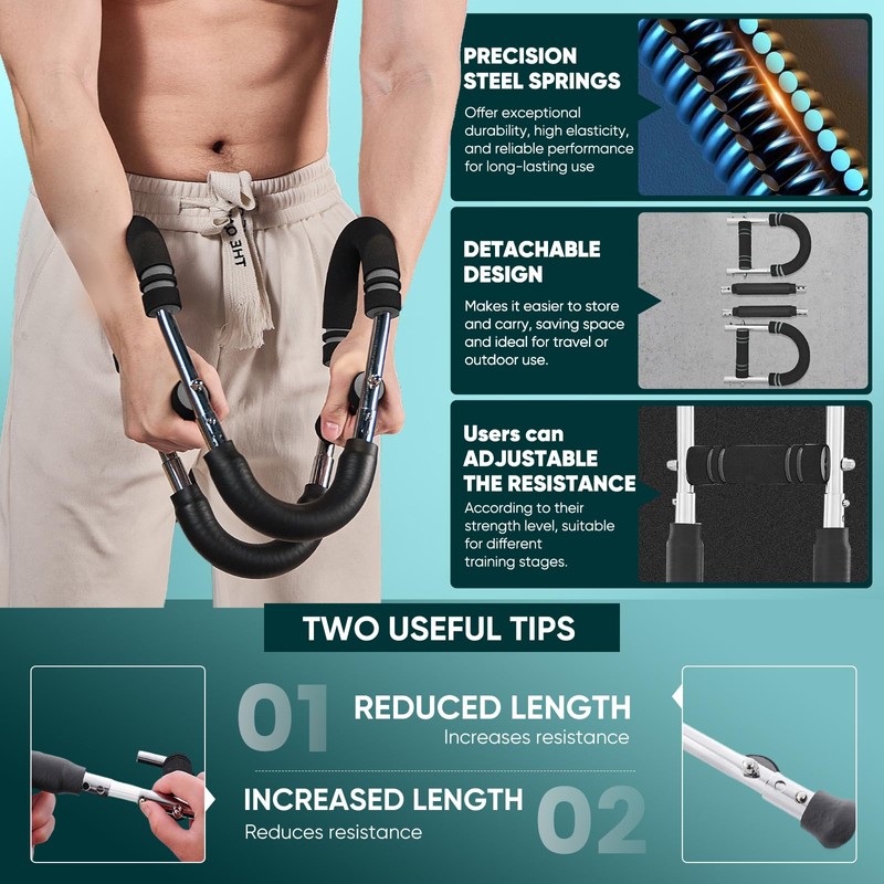 - 【FULL-BODY MUSCLE TRAINING】SakerPlus chest workout equipment stands out from traditional arm workout bars by targeting multiple muscle groups, including the chest, arms, shoulders, back, wrists, and legs. Simple for men and women to use and safe, it's the perfect choice for building strength at home and in the gym.