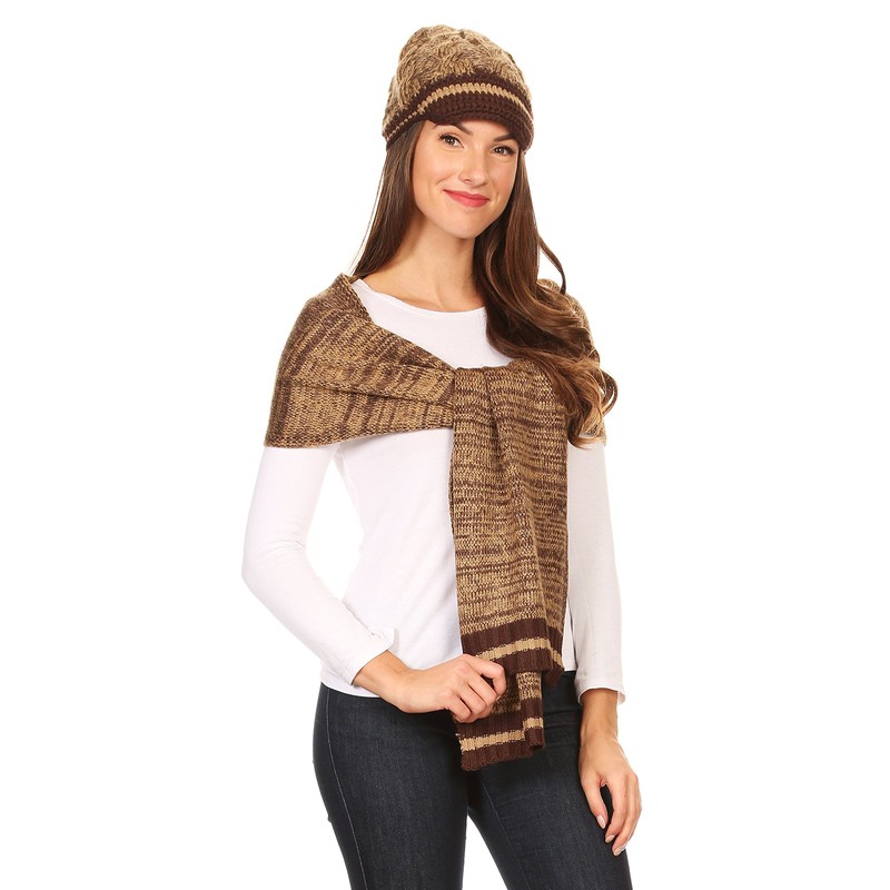 Sakkas 1756 - Theo Unisex Warm Winter Heather and stripes Knit Hat & Scarf Set - Heather brown - OS
