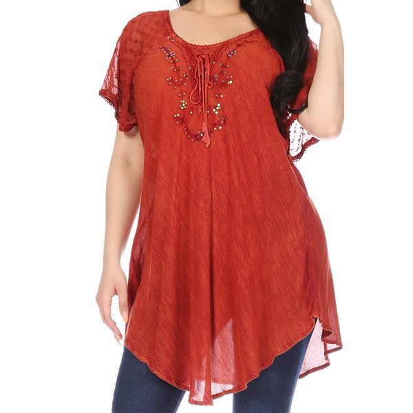 Sakkas Ellie Sequin Embroidered Cap Sleeve Round Neck Relaxed Fit Blouse, red